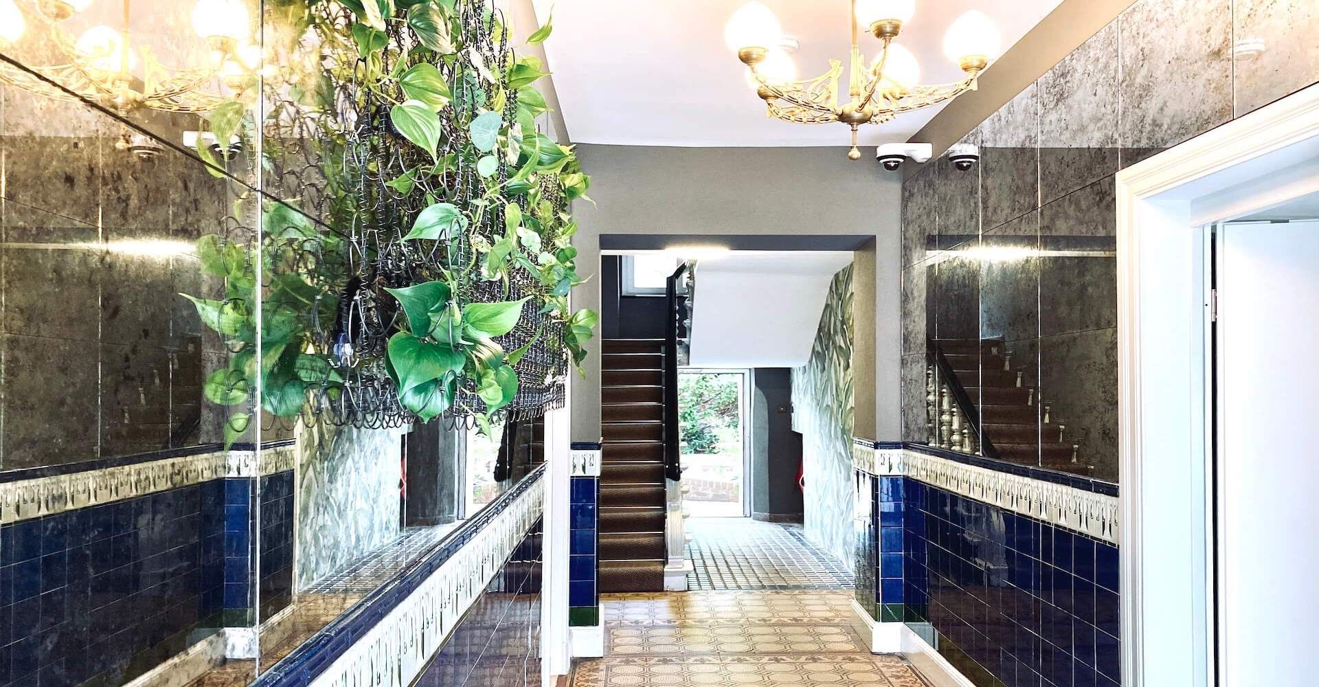 Vaulted brick ceilings and exposed walls give this apartment its unmistakable charm. 2 bedrooms — one with an en-suite — pair beautifully with wooden floors and soft green views. At its heart: a big green couch made for unwinding, conversation, and feeling at home.